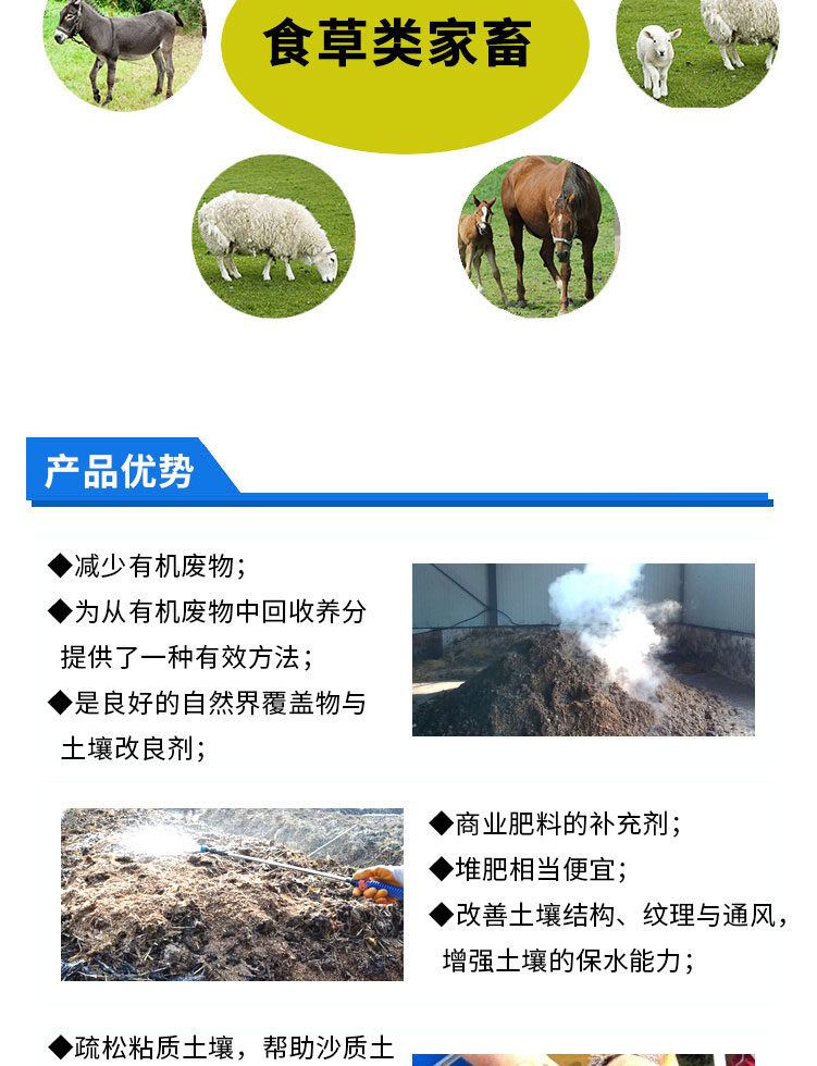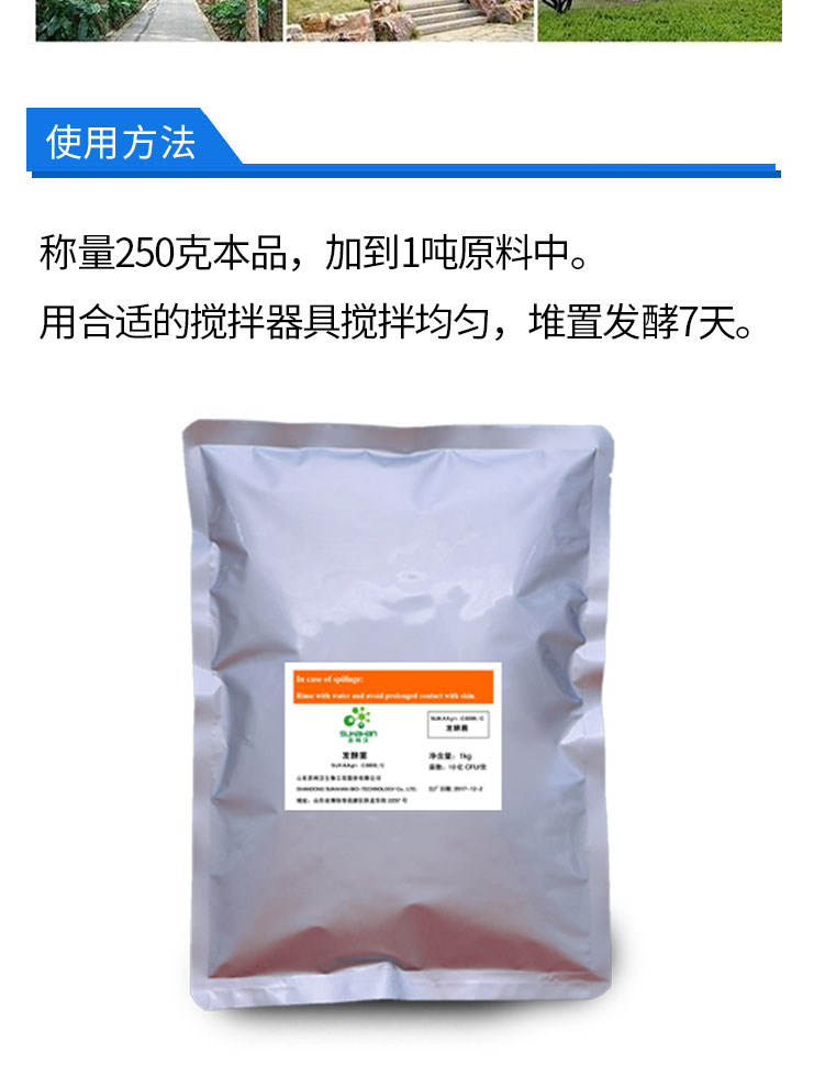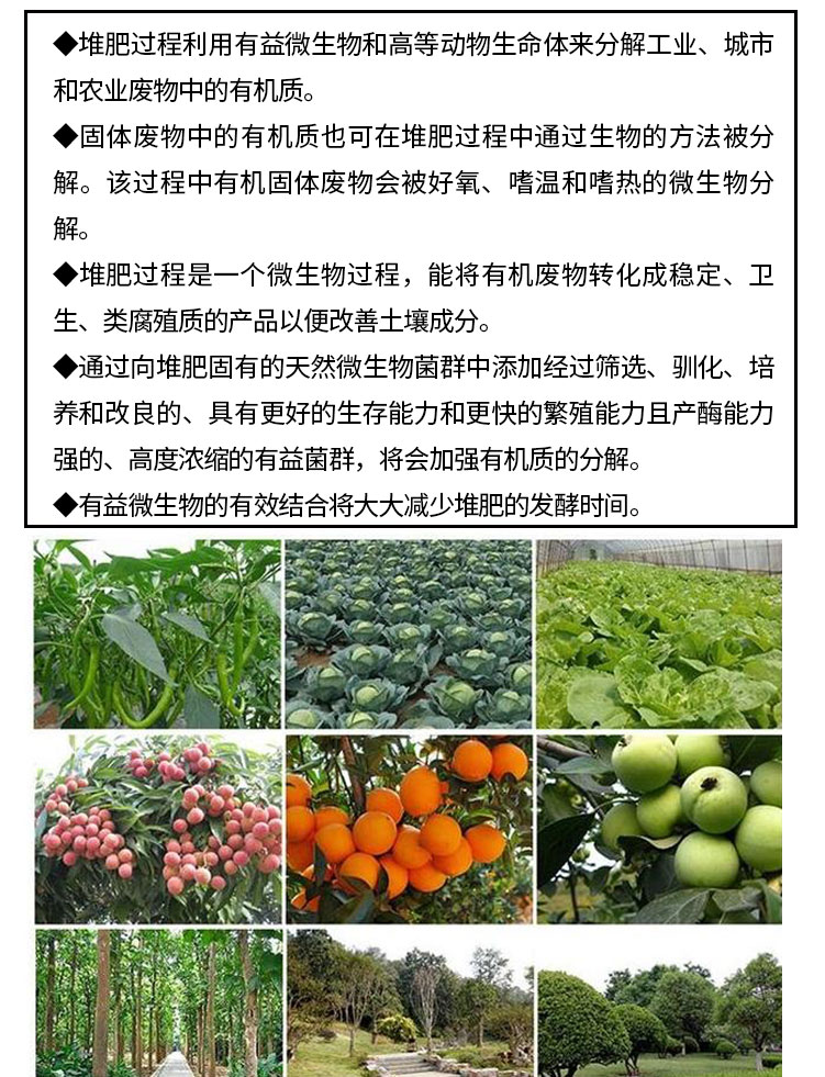在堆肥过程中添加本浓缩产品以补充原始菌种,并加强对有机质的分解以便利用纤维素和农业固体废物生产腐殖质堆肥。